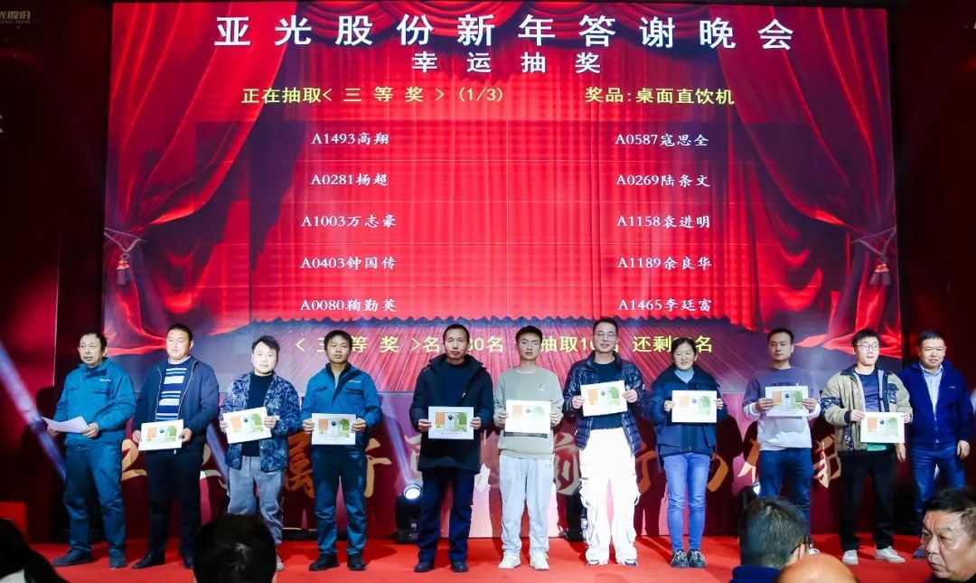 龍馭祥云傳喜報,蛇銜瑞草送佳音。在這歲末年初的溫馨時刻,我們歡聚一堂,共同迎來亞光股份2025新年答謝晚宴的璀璨開場。共享溫馨時刻,共賞藝彩絕倫,共赴美好前程,在這五彩燈帶的交相輝映下,滿場縈繞在熱烈和歡快的氛圍中。
